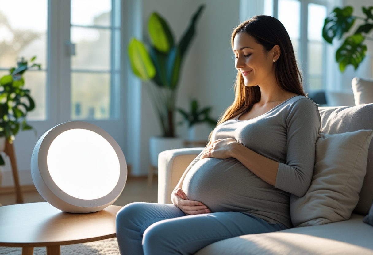 Raskaana oleva nainen istuu olohuoneessa ja käyttää kirkasvalolamppua rauhallisesti.