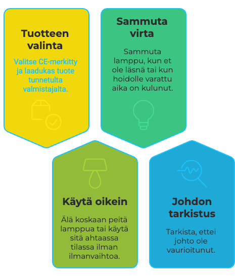 - Paloturvallisuus: Käytä lamppua ohjeiden mukaan ja vältä tuntemattomia halpamalleja.