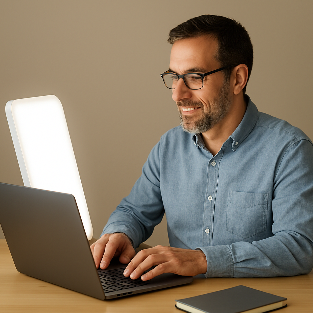 Työpisteellä kirkasvalohoito hoituu kuin huomaamatta. Sinun ei tarvitse erikseen istua “valohoidossa”, kun valo on jo valmiiksi suunnattu kasvojen alueelle.